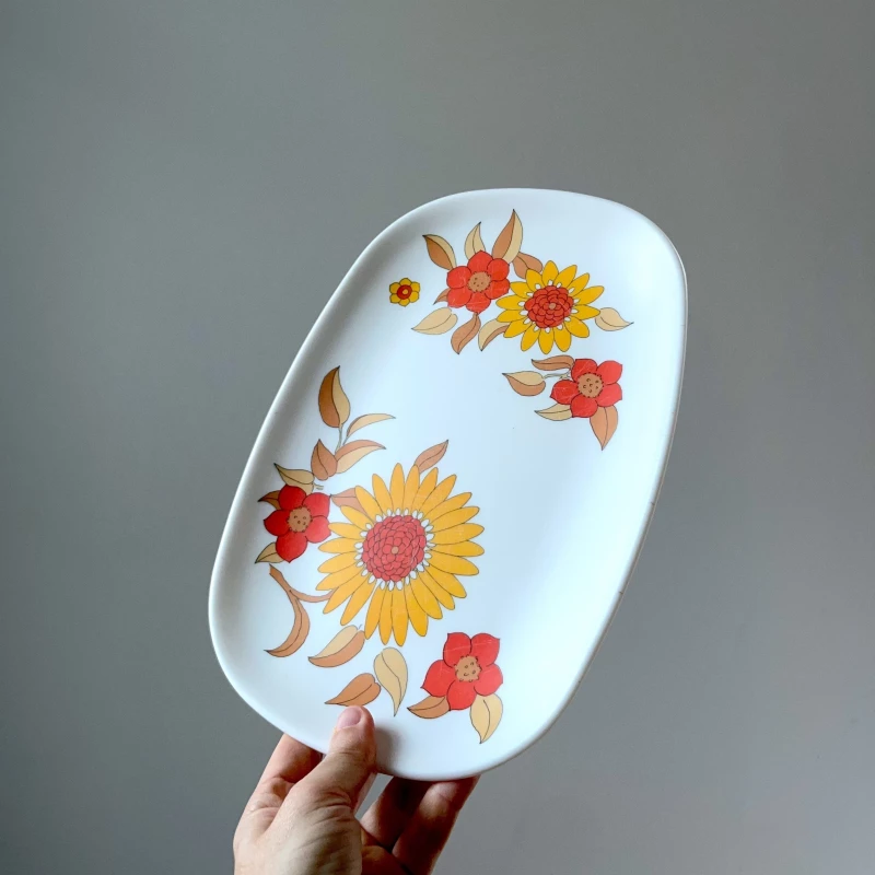 Grand plat de service en mélamine modèle Tournesol édité par Tefal dans les années 70 pour une série camping.