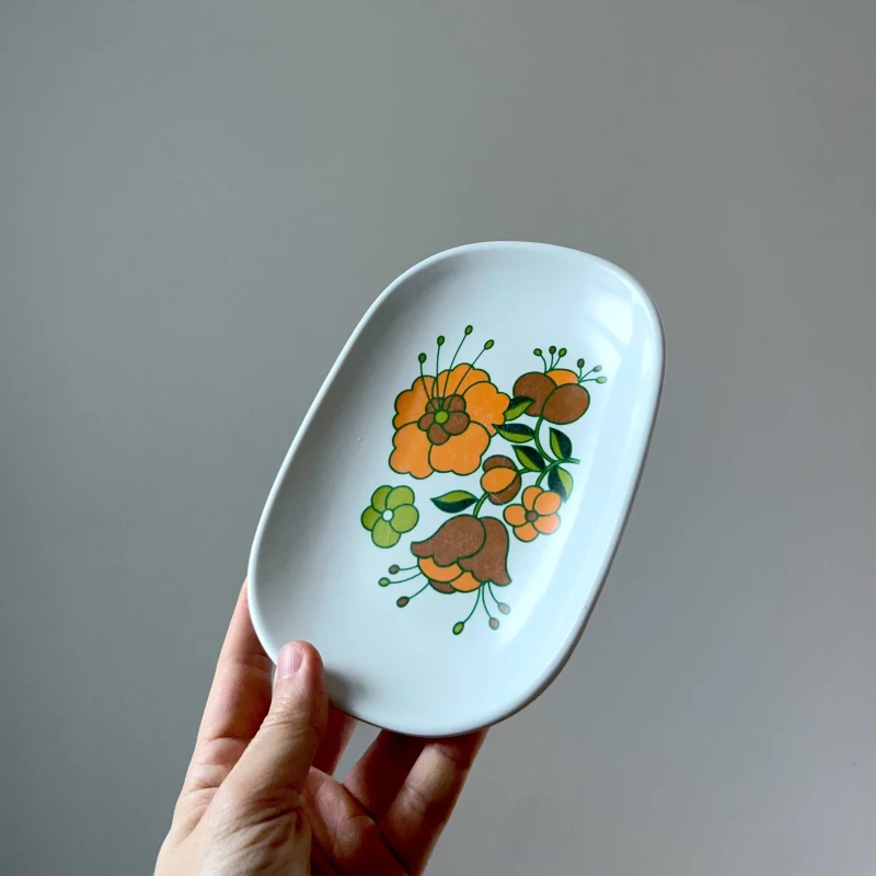 Beau petit plat de service avec ses fleurs oranges édité par Tefal dans les année 70. En résine mélaminé.