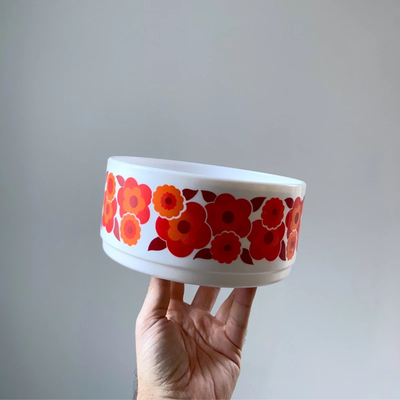 Ancien grand plat/saladier édité par Arcopal dans les années 70 avec son motif Lotus rouge.