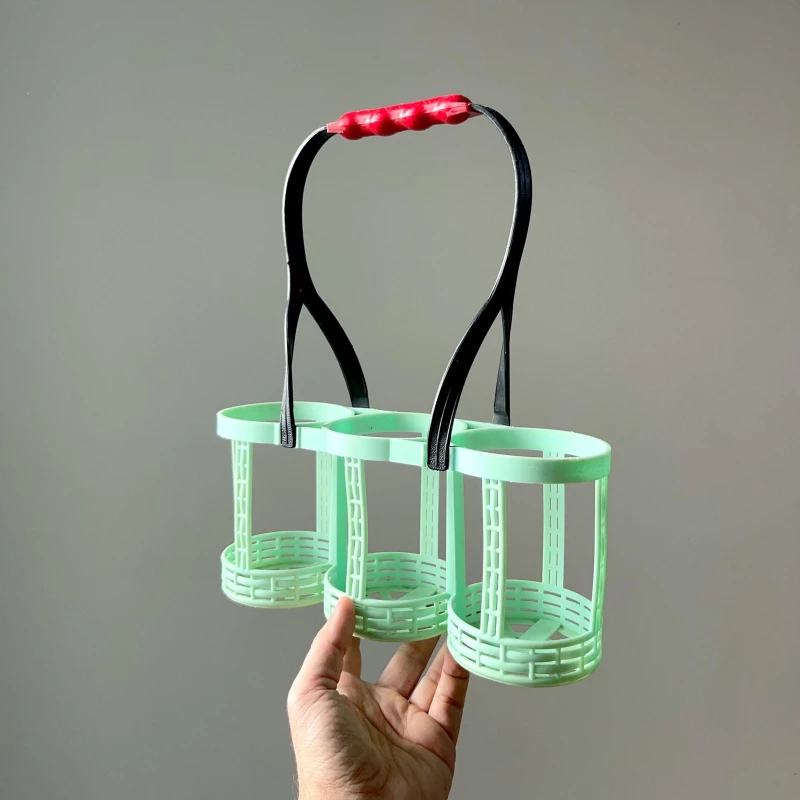 Beau porte bouteille pour 3 bouteilles en plastique avec sa poignée vintage rouge. Bel état.