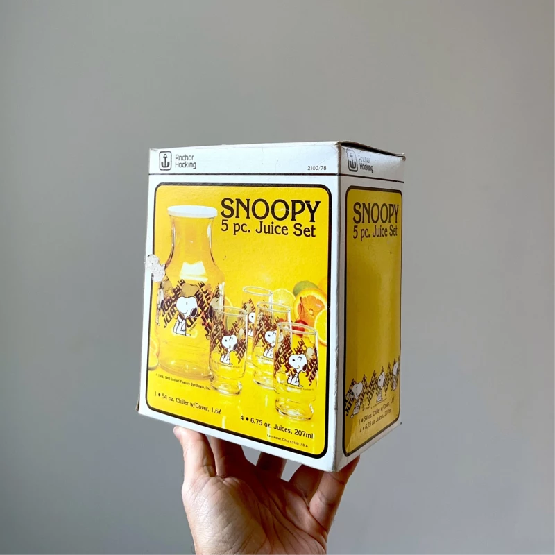 Rare service à jus complet Snoopy, 4 verres et un pichet dans sa boite d'origine. Parfait état.