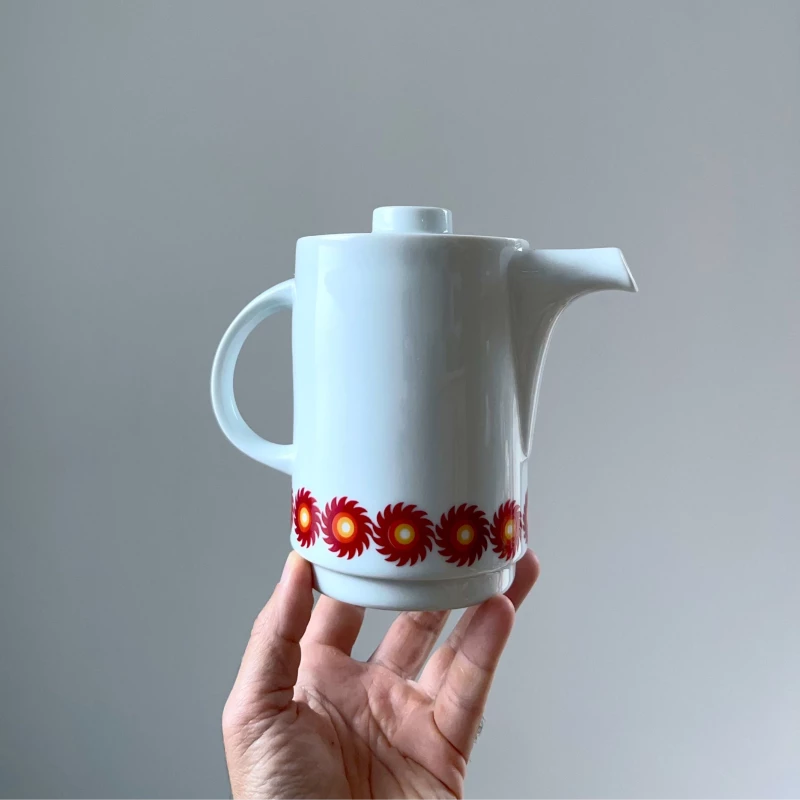 Beau service en porcelaine vintage avec 8 tasses, sous-tasses et verseuse. Quelques traces d'utilisation.