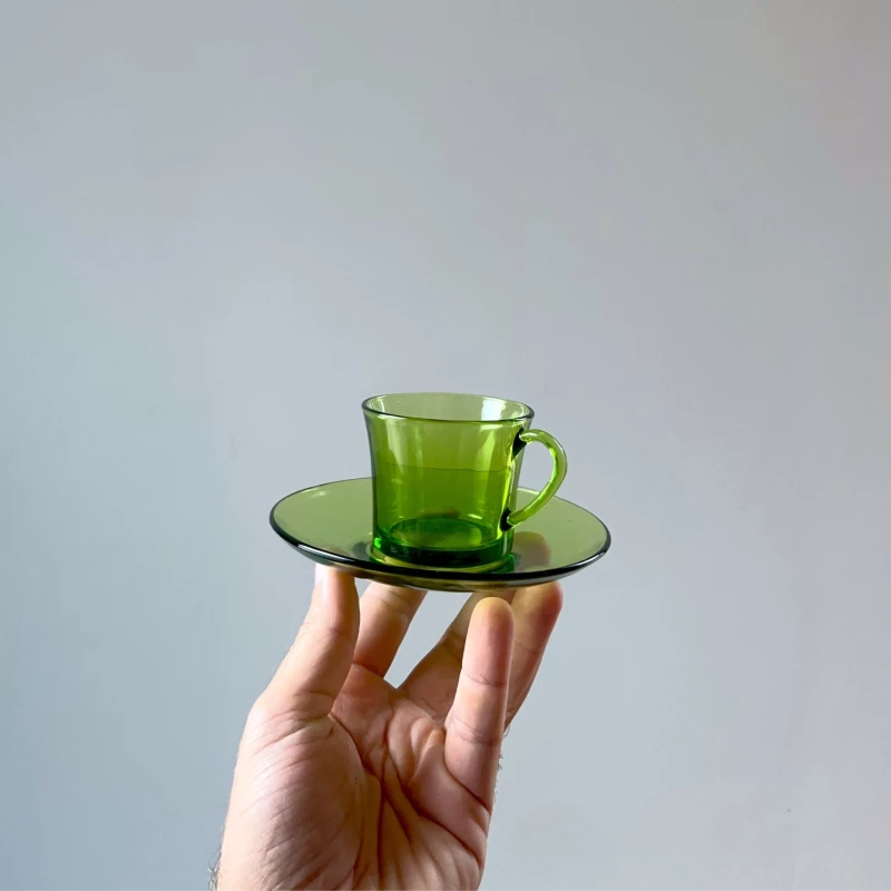 Tasse à expresso avec soucoupe verte par Duralex. Parfait pour le café du matin !