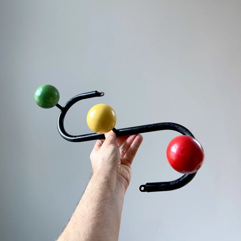 Belle patère avec ses boules tricolores et sa structure tubulaire en forme de S. Très bel état.