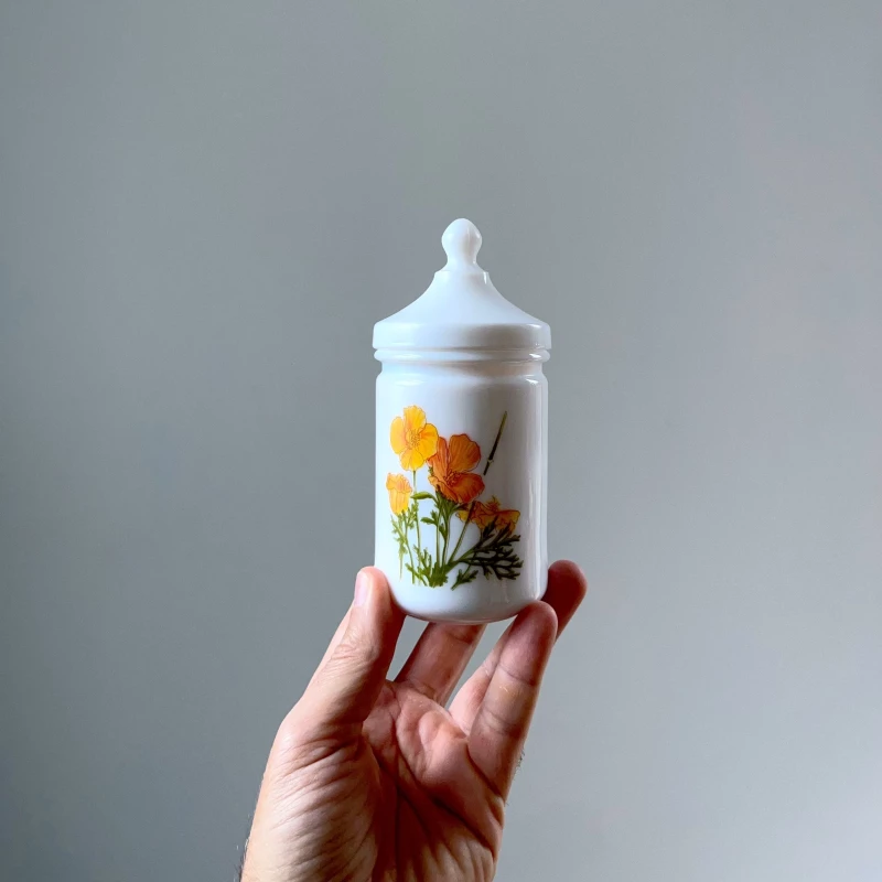 Rare bocal à cotons en opaline avec ses motifs fleurs.