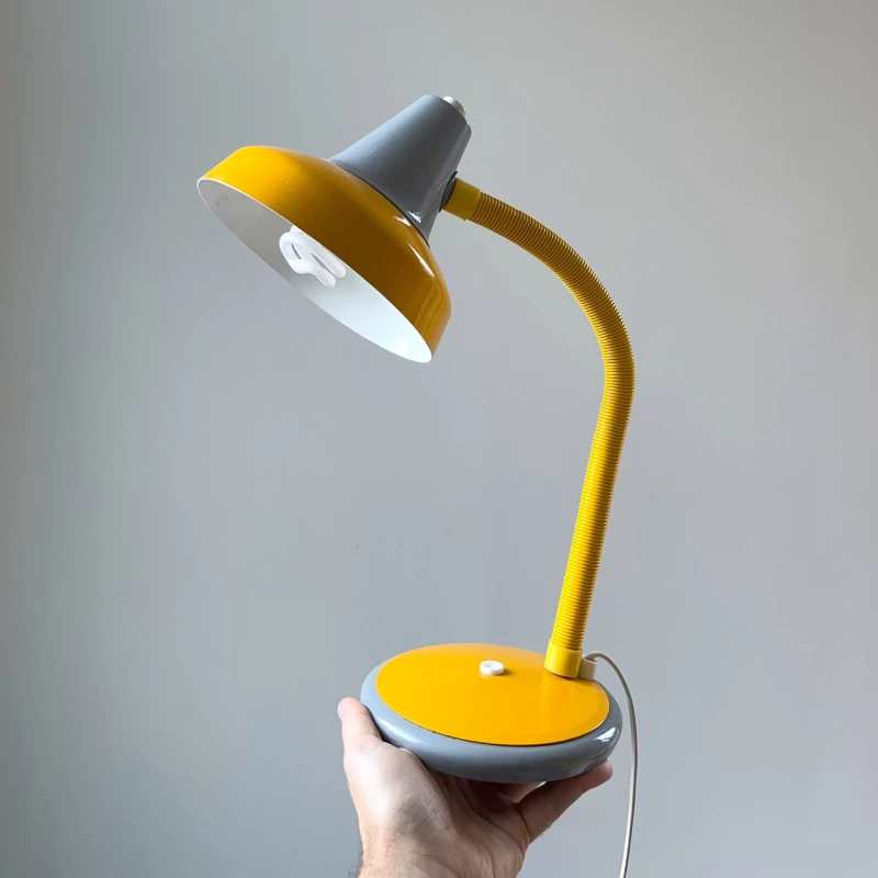 Belle lampe Aluminor flexible des années 70 avec son sur-flexible jaune et ses couleurs jaune et grise. Bel état dans son ensemble.