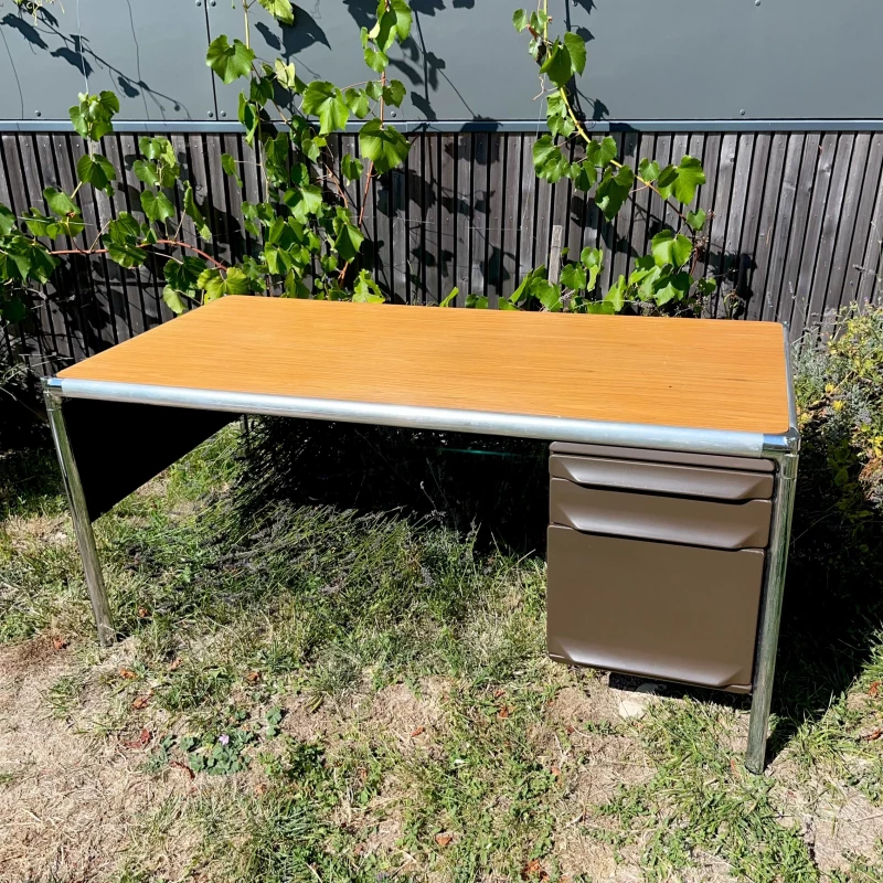 Beau bureau industriel Ronéo modèle Vickers avec un mélange de bois, aluminium, métal chromé et tôle métallique. Caisse à droite avec 3 tiroirs de taille différentes.
