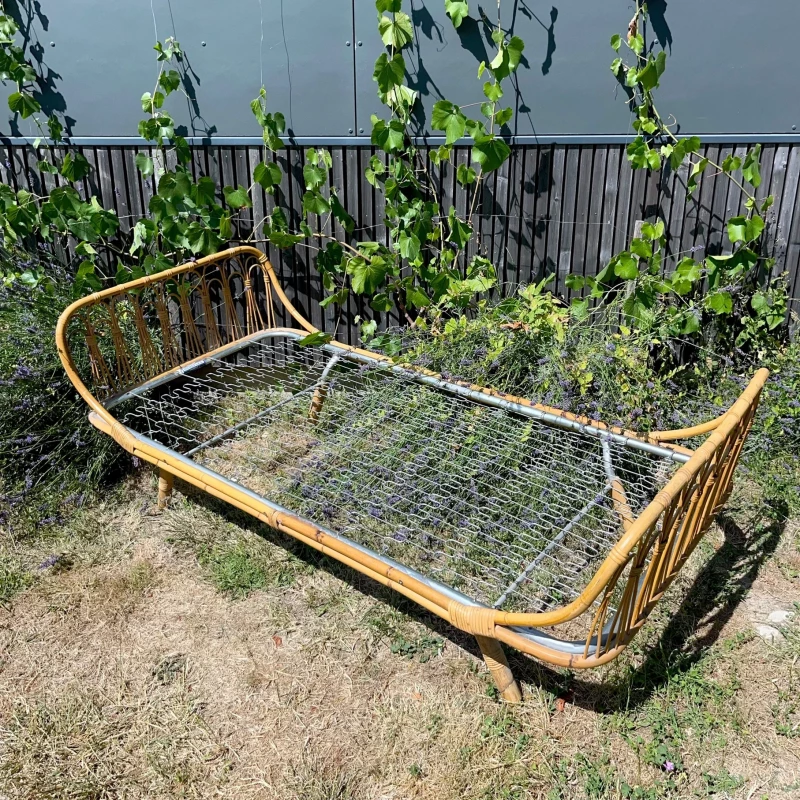 Magnifique lit en rotin 190x90 des années 70 avec son sommier Ondaflex. Parfait état.