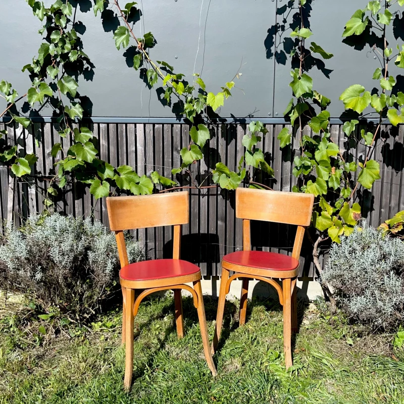 Belle paire de chaise bistrot éditée par Baumann dans les années 60/70. Assise en skaï rouge.